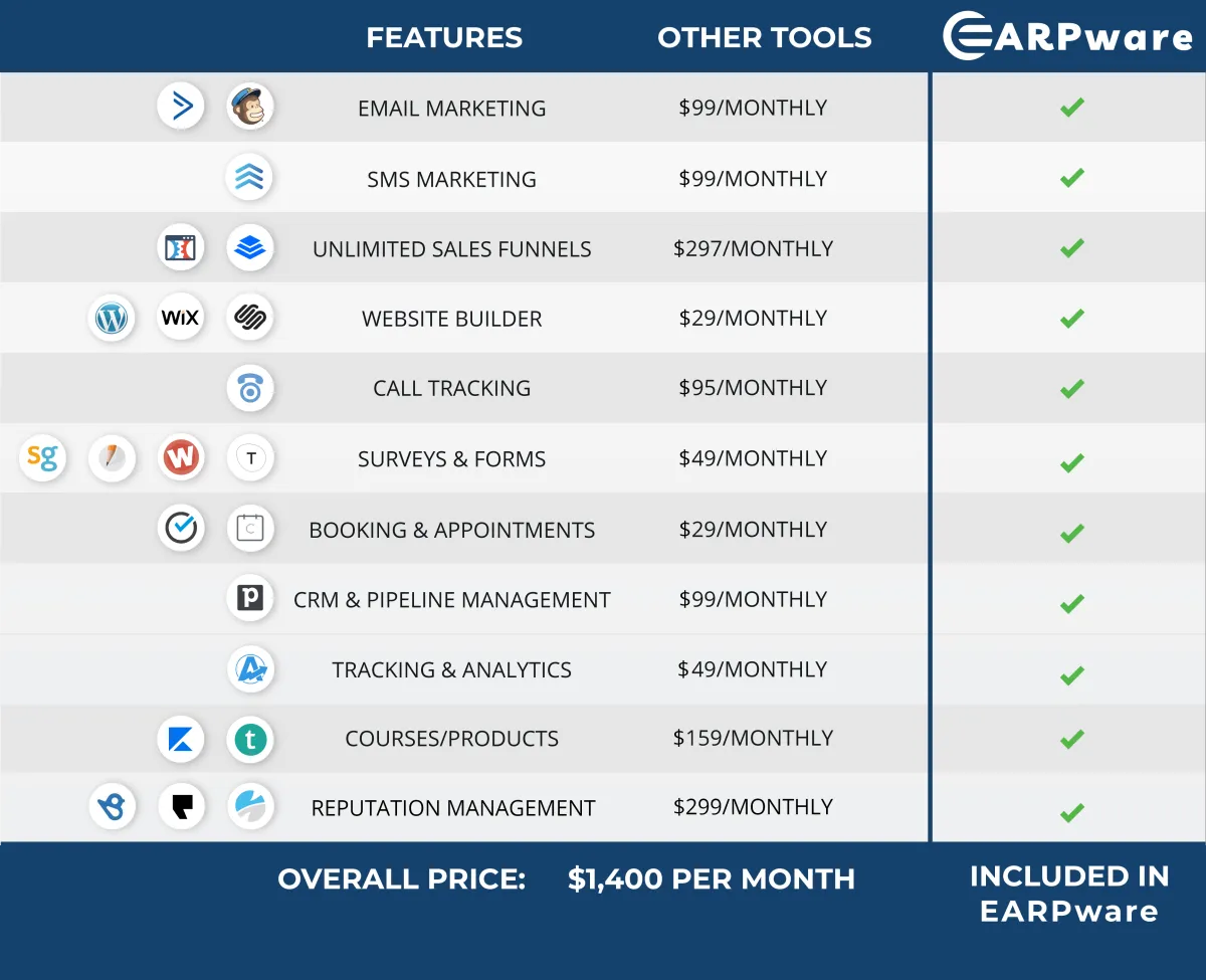 EARPware is an all-in-one marketing software that any business can use. Build websites, funnels, follow-up marketing automation, and get reviews all under one roof!